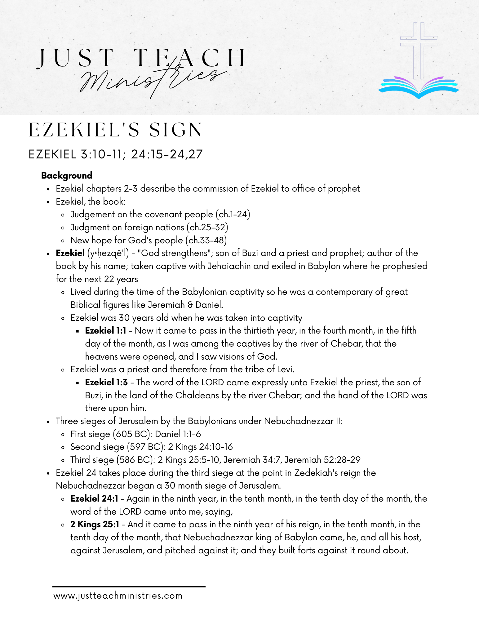 Categories: Select a Category Genesis Exodus Leviticus Numbers Judges Ruth 1 Samuel 1 Kings 2 Kings 1 Chronicles 2 Chronicles Ezra Nehemiah Esther Proverbs Isaiah Jeremiah Daniel Ezekiel Jonah Micah Zephaniah Haggai Zechariah Malachi Matthew Mark Luke John Acts 1 Corinthians Ephesians Philippians Colossians 1 Thessalonians 1 Timothy Titus Hebrews James 1 Peter 2 Peter 1 John Jude Revelation Ezekiel Ezekiel 3:10-11; 24:15-24,27 $1.99 Add To Cart Added!